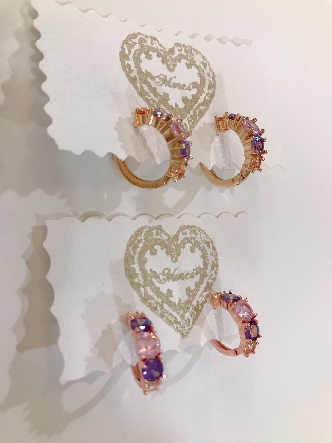 ピンクとパープルのキュービックジルコニアのフープピアスです。