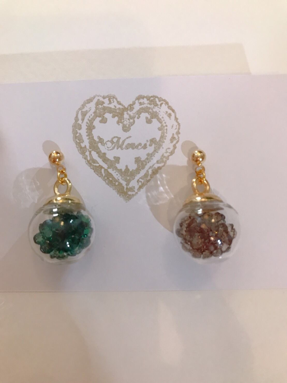 キラキラしたビーズがまるでスノードームのような幻想的な雰囲気のピアスです。