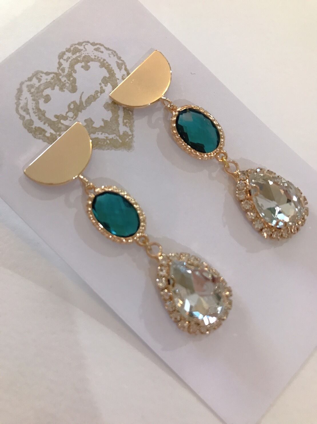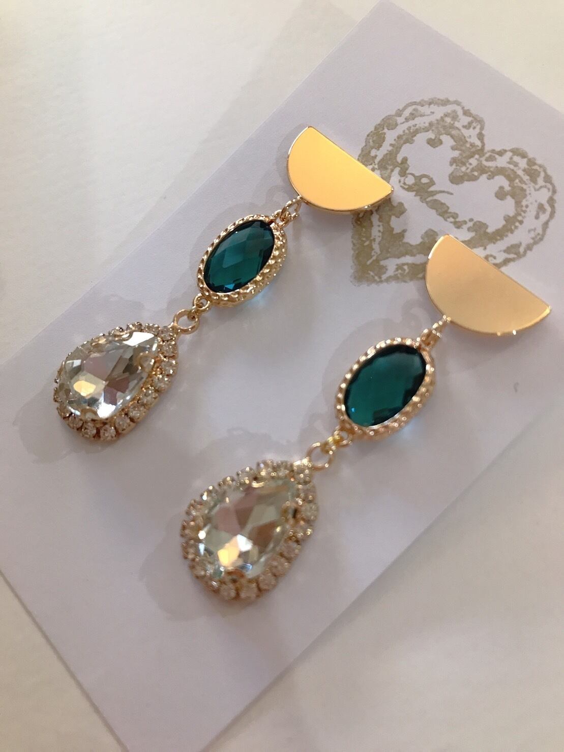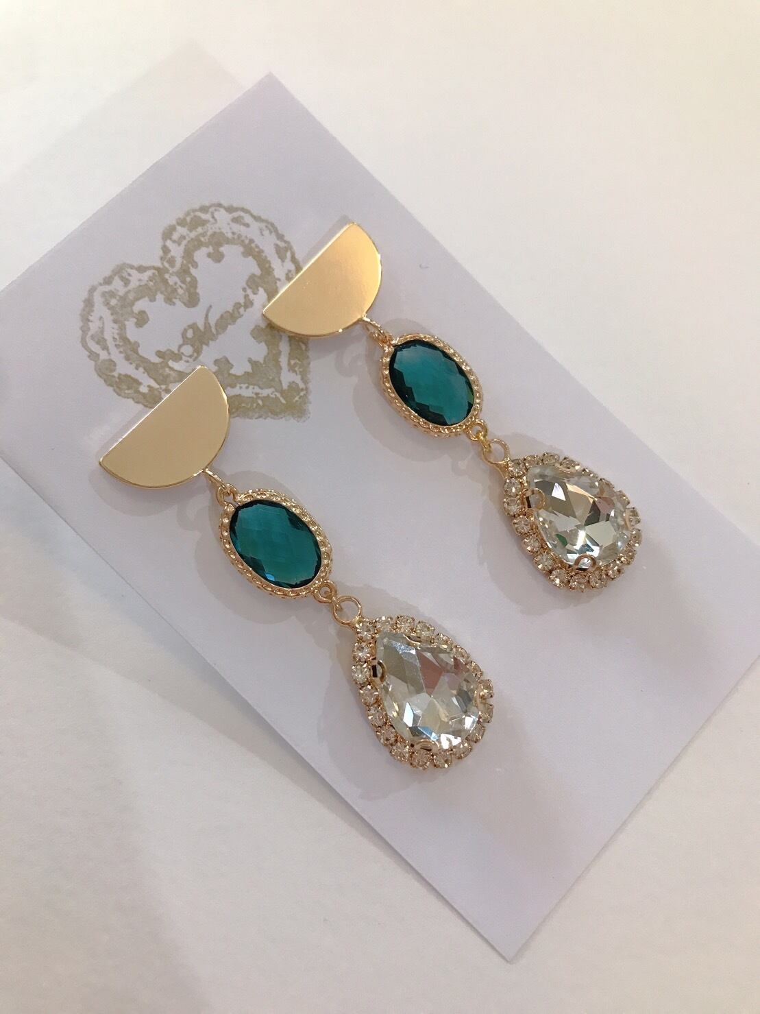 深いグリーンが綺麗な色のピアスです。ボトルグリーンカラーとキュービックジルコニアがキラキラ光ってシックに華やかなピアスです。半円ピアスを使用しています。