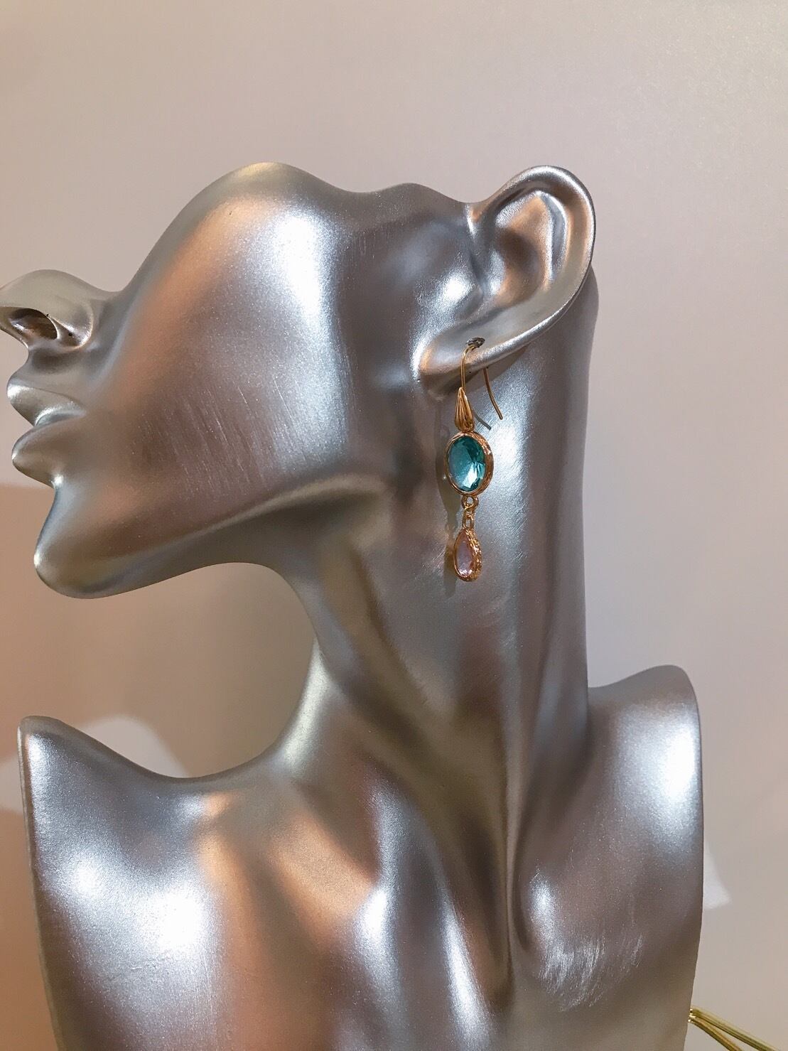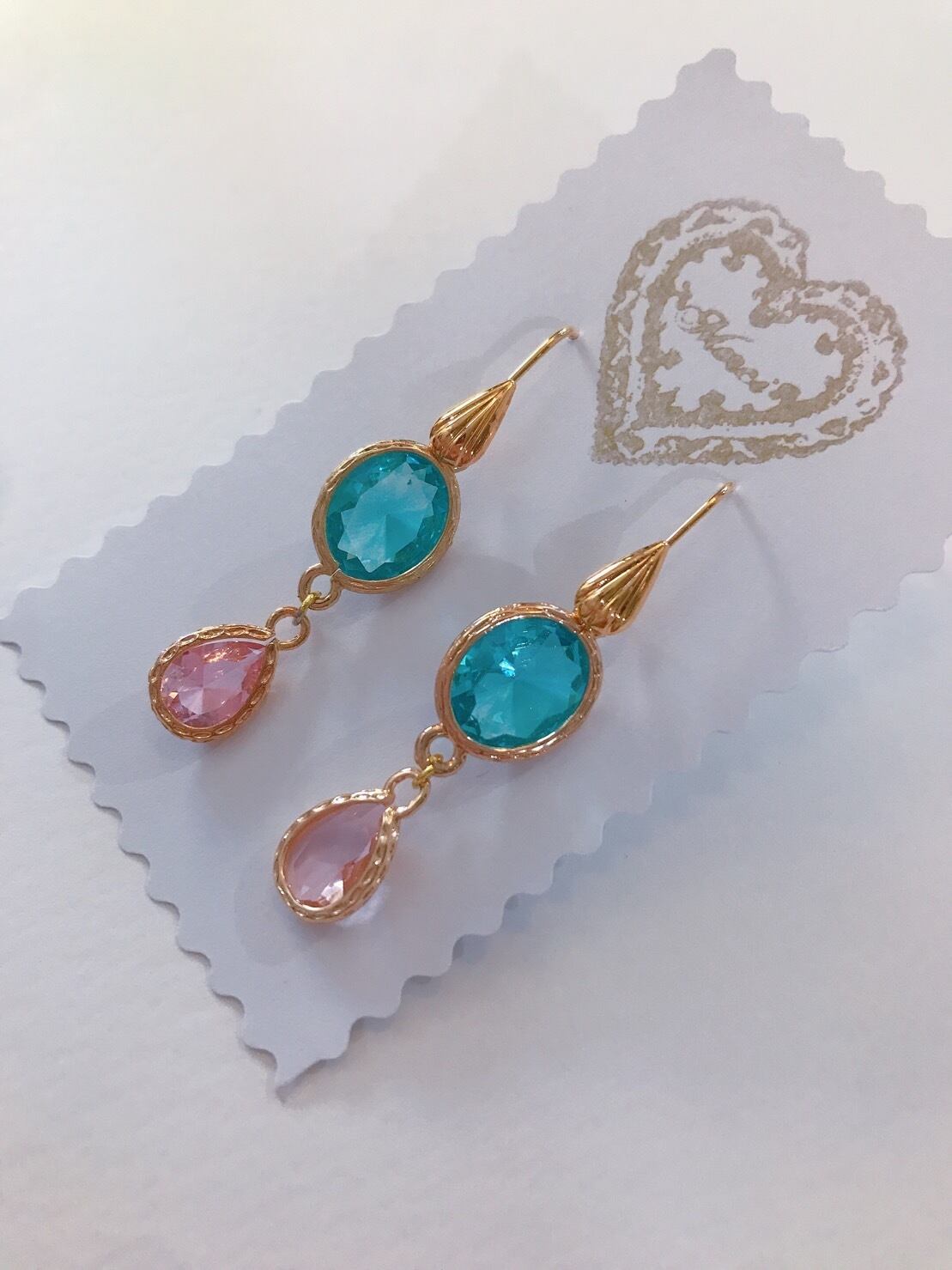 ベビーピンクのドロップガラスチャームが美しいプリンセスな雰囲気のピアスです。