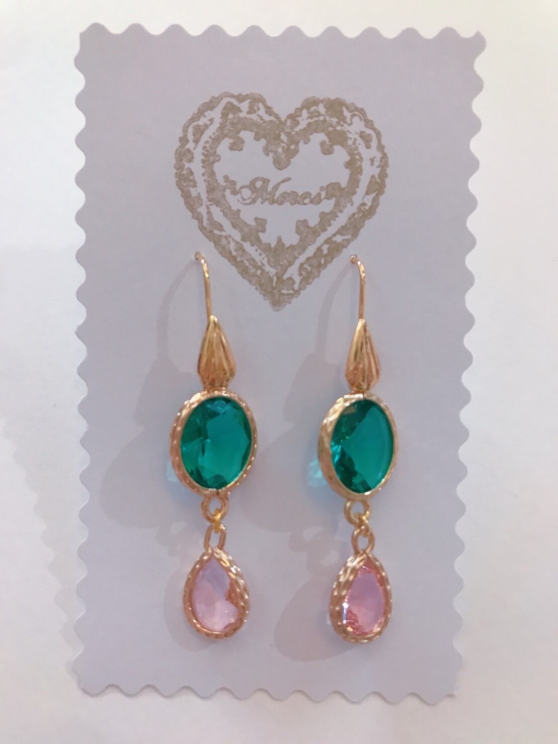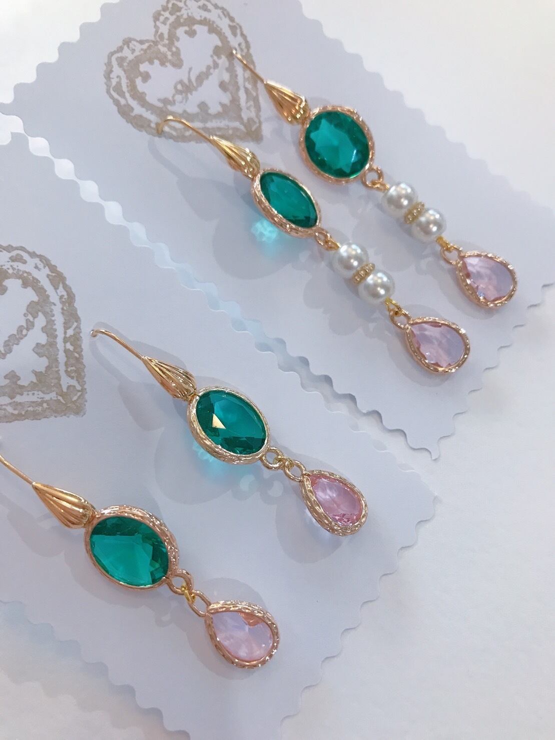ベビーピンクのドロップガラスチャームが美しいプリンセスな雰囲気のピアスです。